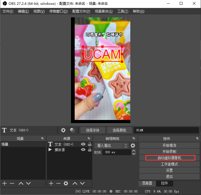 我们在OBS主窗口中播放一段视频,并且加一个文字图层之后,点击启动虚拟相机